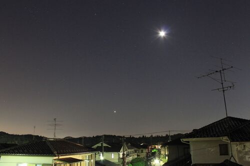 今朝の透明度は空気から音楽が流れてきそうなほど透きとおっていました。 11月らしい快晴です。 そこへ14日に皆既日食を起こす月が近づいています。 正確には曙の中に入り込んできていますが、 写真の対象は明日以降でしょう。 明けの明星であるヴィーナスと…