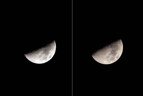 (左)2023/04/27 20h31m (右)2023/04/28 21h56m 4月の上弦は28日06時28分で、日本からは見えませんでした。この二つの月は、その前後ということになります…